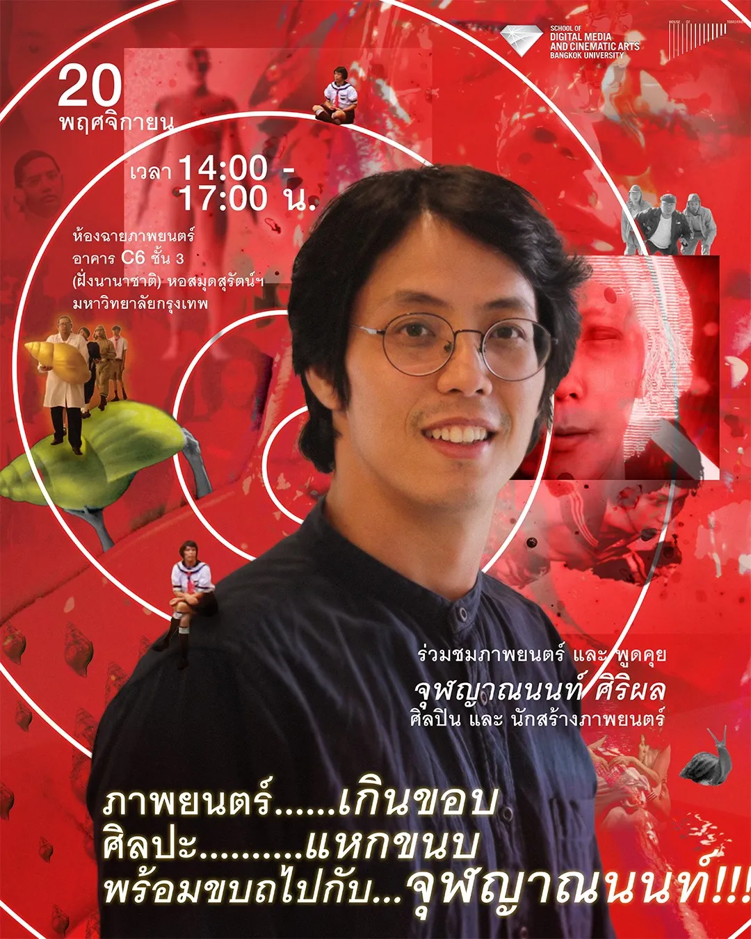 ชวนเปิดประสบการณ์สัมผัสจักรวาลของ “จุฬญาณนนท์ ศิริผล” ศิลปินและนักสร้างภาพยนตร์ร่วมสมัย ผู้ไม่เคยอยู่นิ่งในกรอบผ่านกิจกรรมฉายภาพยนตร์สั้นจากชุด “หอยทากทอง” และชวนพูดคุยว่าด้วยการท้าทายขนบของภาพยนตร์และกรอบเดิมของการสร้างสรรค์