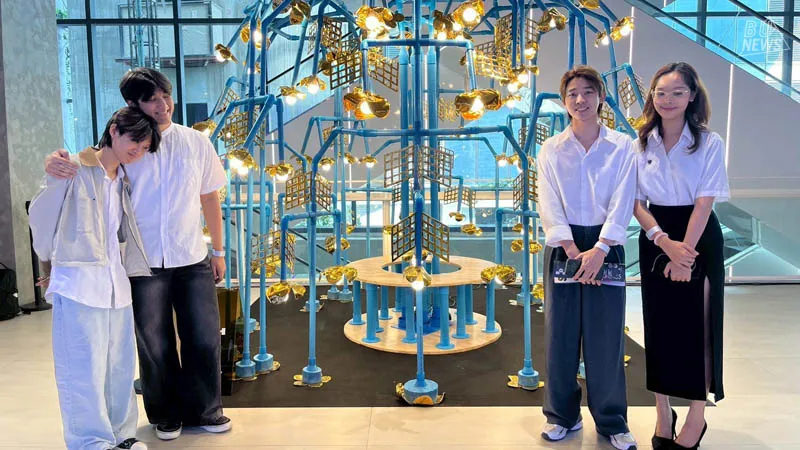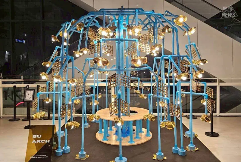 "Our concept was inspired by the Ratchaphruek (Golden Shower Tree) — Thailand's national tree — a symbol of beauty, warmth, and gentle Thai identity. The idea came from observing the naturally overlapping and curving forms of the Ratchaphruek's blossoms, and the way its branches spread outward to create a sense of wholeness and interconnection. We translated this through PVC pipe — a material familiar and tangible to everyone — assembling it into the branching form of the Ratchaphruek spreading in every direction. This is how the name SOMETHING TO STAY WITH NATURE came to be."