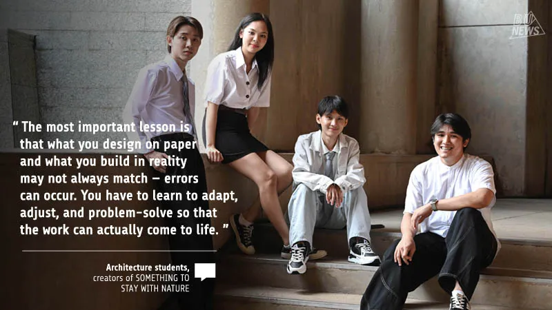 Team Members: Wannawisa Areeua (Jean), Weeraphong Phromwong (Nick), Rathanon Sanit (Rat), and Anawat Phraisaeng (Fluke) — Architecture students, Faculty of Architecture, and creators of SOMETHING TO STAY WITH NATURE.
