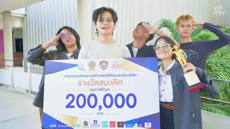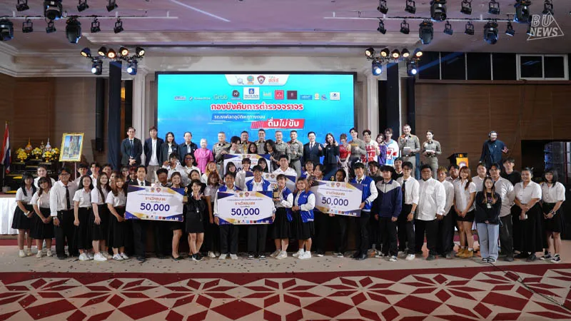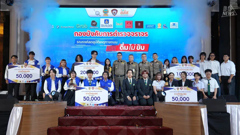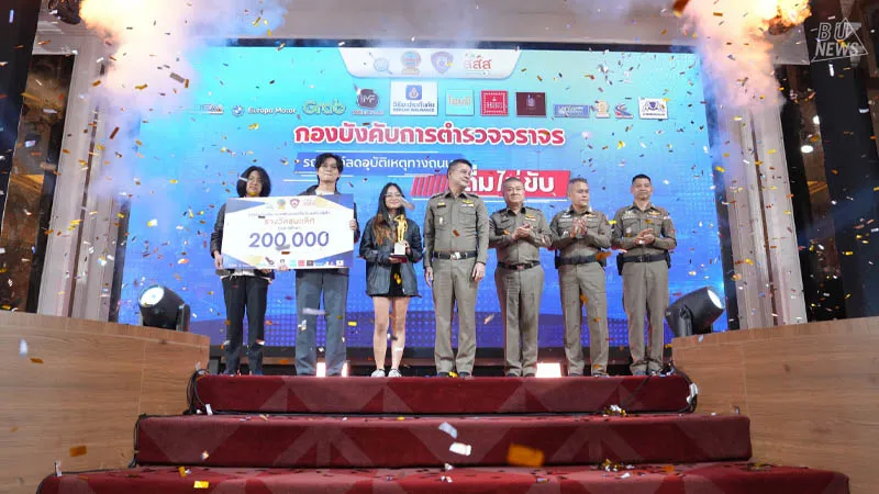 Congratulations to Miss Papaporn Wangworn and Mr. Kanphong Penphatwan, students from Event Production and MICE Management, School of Communication Arts, competing as Team Sleepless Production, who claimed first place and a prize of 200,000 baht in the "Don't Drink and Drive" Creative Media Campaign, organized by the Traffic Police Division in collaboration with the Thai Health Promotion Foundation (ThaiHealth).
