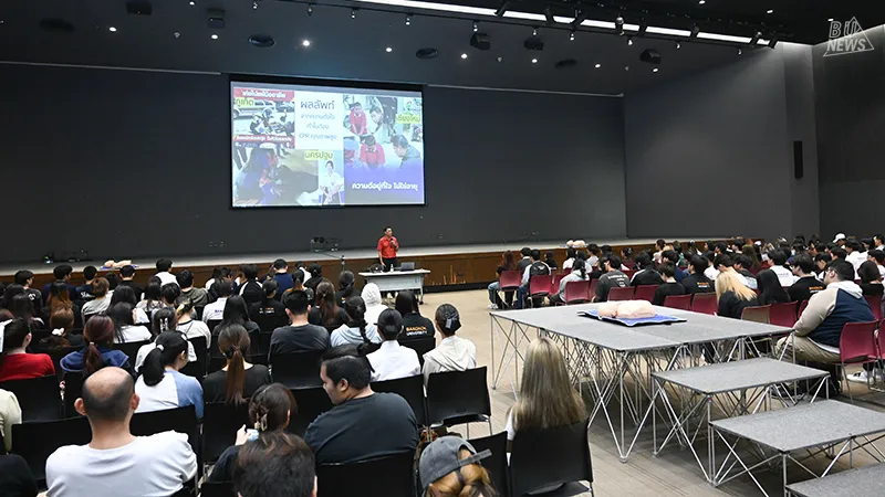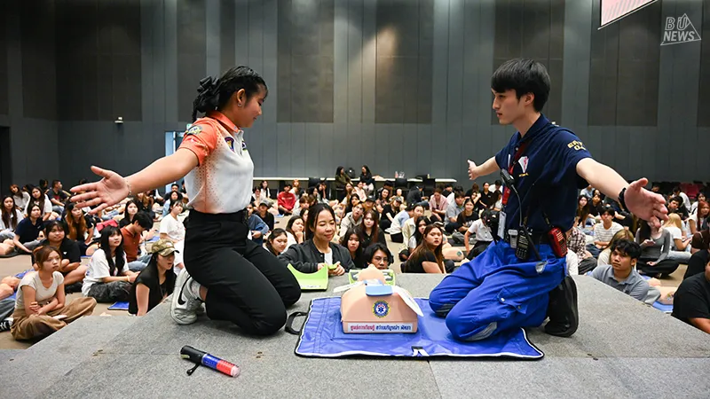 The training was conducted in three sessions at Diamond Hall, 5th Floor, Building A3, Bangkok University. The objective was to enhance students' knowledge and skills in cardiopulmonary resuscitation and emergency first aid, enabling them to provide timely assistance to emergency victims and increase survival rates among the public.