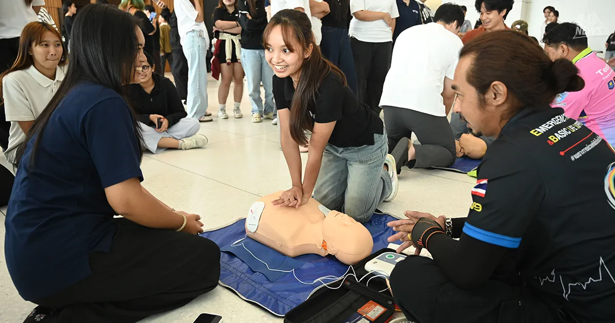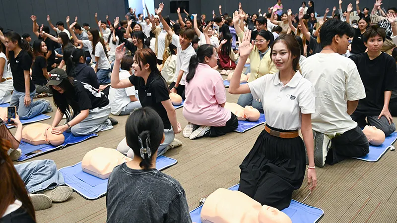 General Education Administration Center, in collaboration with the Student Affairs Division, organized a workshop on "Basic CPR & AED, and First Aid Training: Emergency First Aid and Basic Life Support" to promote and develop cardiopulmonary resuscitation and emergency first aid skills under the concept "Saving lives is everyone's responsibility." The program featured instructors from the Teach for Life Association and the Oxyfight Foundation, who provided demonstrations and knowledge to students.