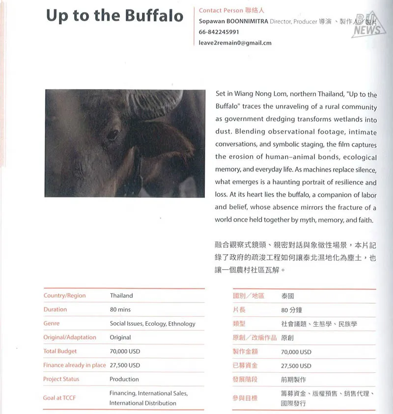 Congratulations to Dr.Peerachai Kerdsint, Assistant to the President for Academic Affairs and act for Dean, School of Digital Media and Cinematic Arts, Bangkok University, whose feature-length documentary film project "Up to the Buffalo" was selected to represent Thailand and participate in the Pitching session at the Taiwan Creative Content Festival 2025 (TCCF). The project received 2 awards: the Sustainable Future Award and the Docs by the Sea Award - two awards that encourage the storytelling of the Wiang Nong Lom wetland, where people and buffaloes still breathe together.