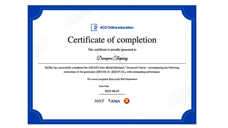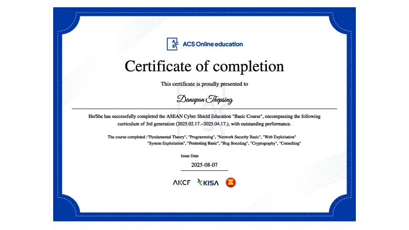 Being selected for the program didn't mean an immediate trip to South Korea. Participants had to go through an intensive 6-month learning and selection process divided into two challenging phases. "The first three months involved foundational learning entirely online, covering everything essential for cybersecurity professionals—from programming, network security, website attacks and defense, system penetration, to basic penetration testing. Everything was taught in English, and most of it was foundational, similar to what we learn at Bangkok University."