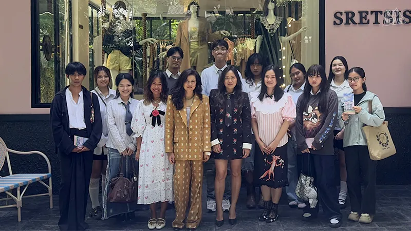 The project was made possible through collaboration with Sretsis, offering students the opportunity to participate in a field visit to Sretsis Inn Bangkok to study archive pieces, materials, details, and techniques from actual collections, as well as to attend a lecture by the design team, led by all three founders — K.Khlaiduen Sukhahut, K.Pimdao Sukhahut, and K.Matina Sukhahut — who shared their design philosophy connecting imagination with environmental responsibility.