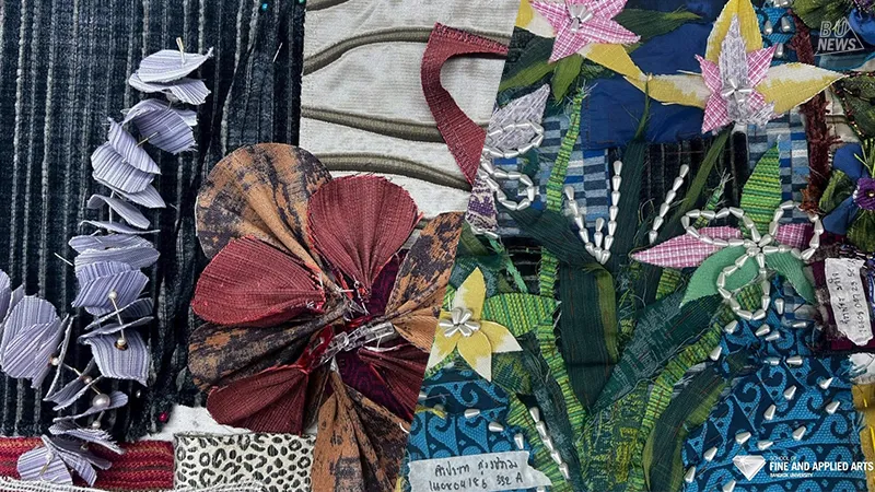 2. The Collage Arts: From Fabric Waste to Collage Arts Creation: BU x Oh My Craft Studio x Jim Thompson – A Sustainable Project was organized to enhance teaching and learning and to encourage students to explore the design process through the lens of Sustainable Design. This project was held for 2nd-year students enrolled in the course FSD333 Textiles Surface Design, with instructors including Dr.Orrapavadee Serewiwattana, A.Theera Chantasawat, and A.Thitiporn Niranwichaya.