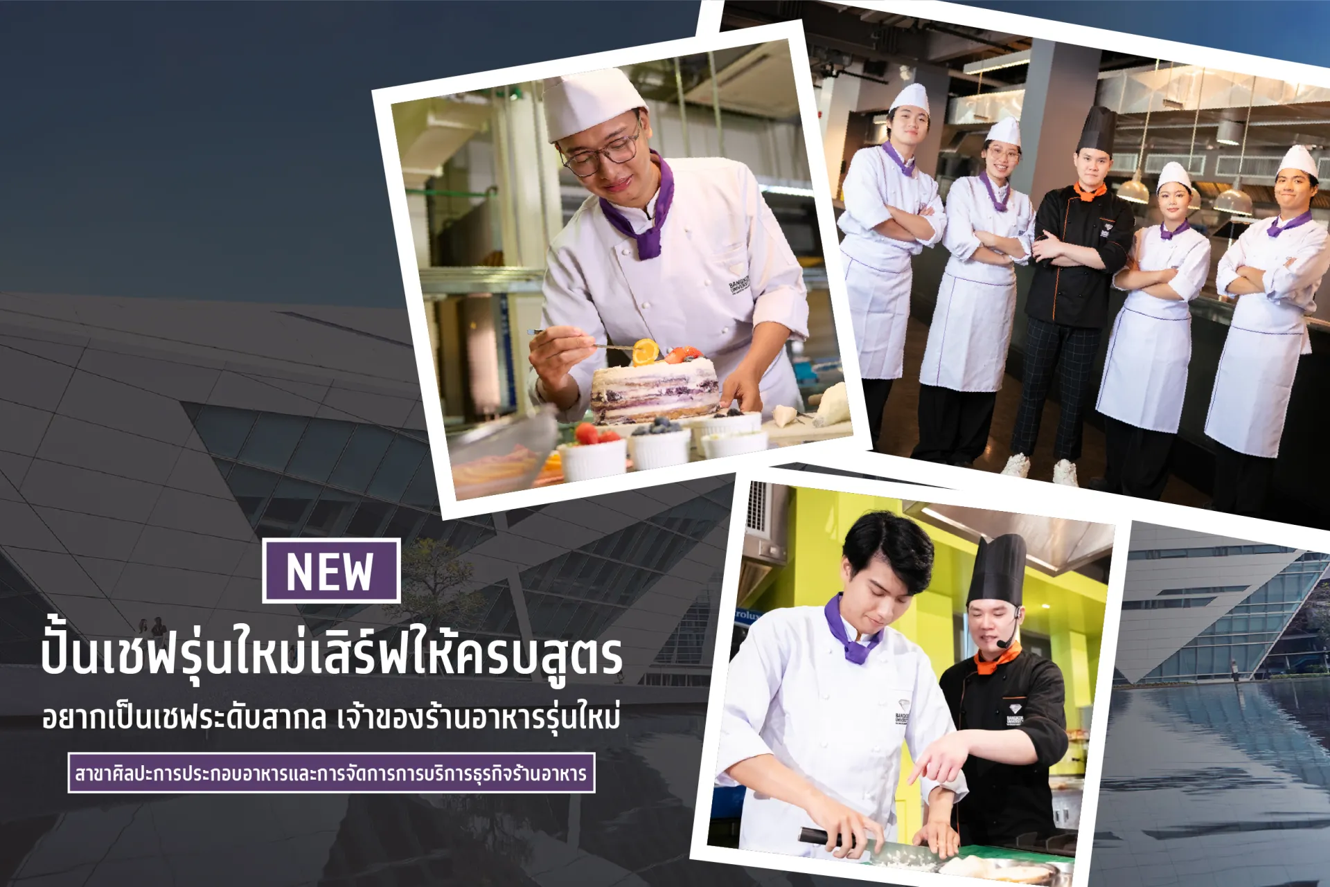 ยุคนี้เชฟไม่ได้เก่งแค่ในครัว ต้องเจาะลึกทั้งโลกของธุรกิจอาหาร ต่อยอดสู่ความเป็นเชฟยุคใหม่ที่คิดเป็น ทำได้ และบริหารเป็นเต็มตัว เรียนครบตั้งแต่เทคนิคครัวระดับโลก สาขาศิลปะการประกอบอาหารและการจัดการการบริการธุรกิจร้านอาหาร คณะมนุษยศาสตร์และการจัดการการท่องเที่ยว ครบทั้งทักษะอาหารไทยและนานาชาติ ไปจนถึงการบริหารจัดการร้านอาหารจริง ฝึกปฏิบัติห้องปฏิบัติการทันสมัยกับเชฟมืออาชีพฝึกงานกับร้านอาหารทั้ง Fine Dining และ Catering พร้อมโอกาสคว้าประกาศนียบัตรวิชาชีพจากสถาบันชั้นนำทั้งในประเทศและต่างประเทศ สามารถเลือกเรียนภาษาที่ใช่เพื่อขยายเส้นทางอาชีพในครัวสากล เรียนจบได้ใน 3 ปี ได้ทั้งความรู้และคอนเน็คชันในวงการอาหาร