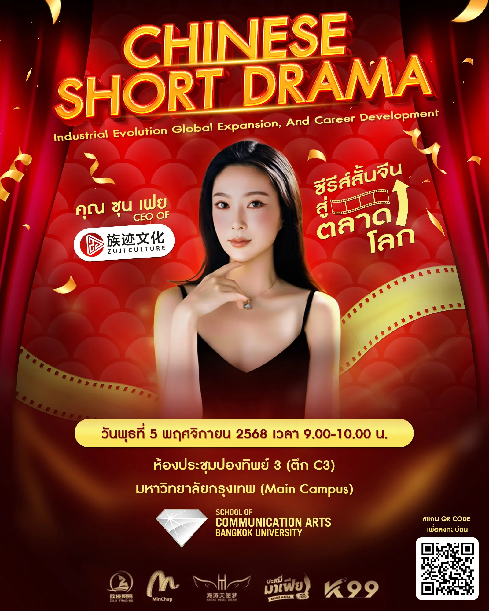 เทศกาลละครสั้นนานาชาติ ORCAS ร่วมกับ บริษัท Zuji Culture (เซี่ยงไฮ้) ประสานกับคณะนิเทศศาสตร์ มหาวิทยาลัยกรุงเทพ จัดบรรยายพิเศษหัวข้อ “Chinese Short Drama: Industrial Evolution Global Expansion, And Career Development” หรือ ละครสั้นจีน: วิวัฒนาการซีรีส์สั้นจีน: การพัฒนาอุตสาหกรรม การขยายสู่ตลาดโลก และโอกาสทางอาชีพ” บรรยายโดย คุณซุนเฟย (孙菲) ประธานบริษัท Zuji Culture ผู้อยู่เบื้องหลังผลงานระดับบล็อกบัสเตอร์ เช่น