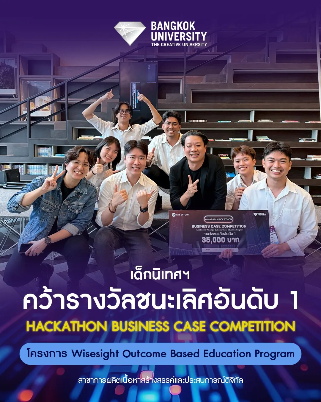 เด็กคณะนิเทศศาสตร์ มหาวิทยาลัยกรุงเทพ สายครีเอทีฟ คว้ารางวัลชนะเลิศอันดับ 1 จากการแข่งขัน Hackathon Business Case Competition สาขาการผลิตเนื้อหาสร้างสรรค์และประสบการณ์ดิจิทัล จัดเต็มกับโจทย์จริง วิเคราะห์ข้อมูลเชิงลึกจาก Social Data ให้กลายเป็นกลยุทธ์ที่ตอบโจทย์แบบทันเวลา พร้อมต่อยอดสู่ผลงานระดับ Portfolio ได้ทันที ภายใต้โครงการ Wisesight Outcome Based Education Program