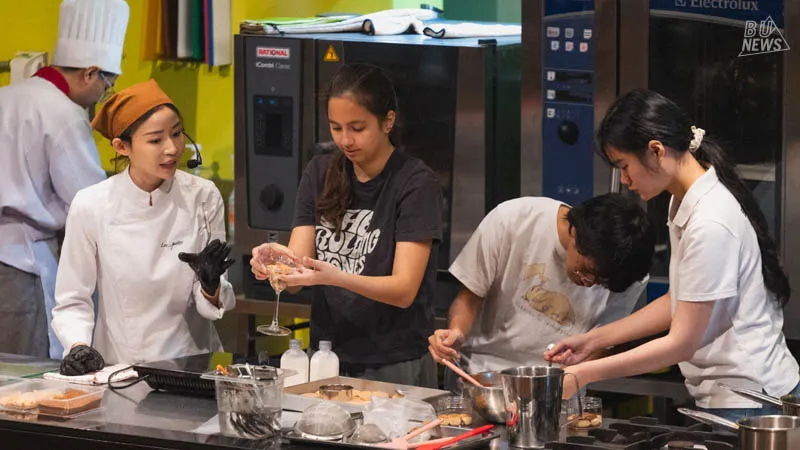 นอกจากนี้จุดเด่นของงาน คือการสาธิตการทำ Chocolate and Roasted Almond Ladyfingers ขนมสุดคลาสสิกที่ผสมผสานเทคนิคการทำขนม ความละเอียดอ่อน และศิลปะการนำเสนออย่างลงตัว นักศึกษาได้เห็นกระบวนการทำงานแบบมืออาชีพ ตั้งแต่การเตรียมวัตถุดิบ เทคนิคการผสม การอบ ไปจนถึงการจัดจาน ที่แต่ละขั้นตอนล้วนแต่เต็มไปด้วยความประณีตและความใส่ใจในรายละเอียด และพิเศษยิ่งขึ้นเมื่อนักศึกษาได้มีส่วนร่วมในการสาธิต ได้ลงมือปฏิบัติจริงควบคู่ไปกับเชฟทำให้เกิดการเรียนรู้แบบ hands-on และได้ลิ้มลองชิมรสชาติของผลงานที่ทำร่วมกัน ซึ่งไม่เพียงแต่อร่อยเท่านั้น แต่ยังเต็มไปด้วยความภาคภูมิใจและความทรงจำที่ประทับใจ