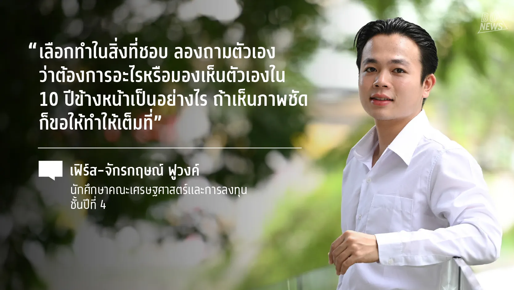 เมื่อถูกถามถึงแรงบันดาลใจที่ทำให้ตัดสินใจเลือกศึกษาต่อที่คณะเศรษฐศาสตร์และการลงทุน มหาวิทยาลัยกรุงเทพ และหันมาสนใจอาชีพนักวิเคราะห์การลงทุน เฟิร์สได้เล่าเรื่องราวที่น่าสนใจว่า "ตอนเด็กๆ ผมใฝ่ฝันอยากเป็นนายร้อย แต่ความฝันนั้นเปลี่ยนไปเมื่อได้พบกับนักลงทุนที่ประสบความสำเร็จ ทำให้ผมอยากเดินตามรอยเท้าของเขา" พร้อมปิดท้ายว่า "ผมเชื่อมั่นว่า หากเราค้นพบสิ่งที่รักและอุทิศตนให้กับมันอย่างเต็มที่ ความสำเร็จก็อยู่ไม่ไกลครับ"
