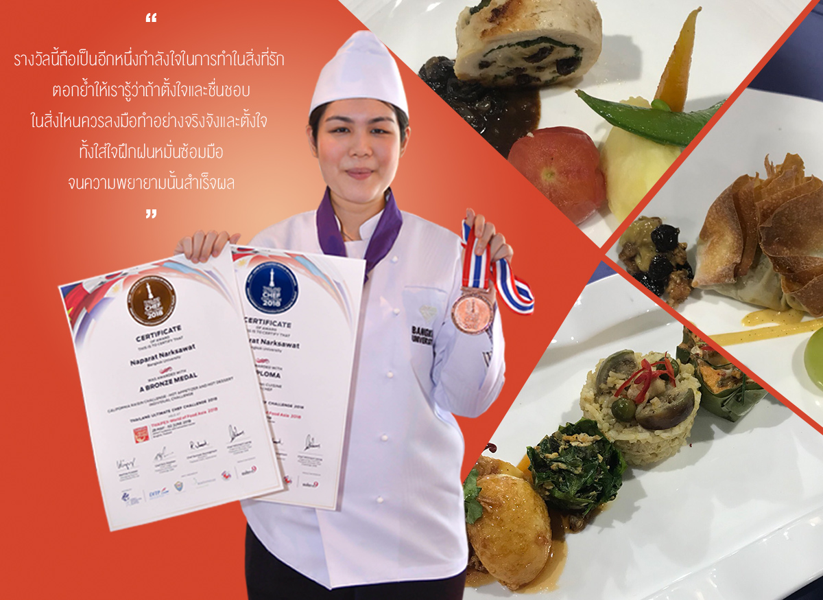 นางสาวนภารัตน์ นาคสวัสดิ์ นักศึกษาสาขาวิชาการจัดการการโรงแรม คณะมนุษยศาสตร์และการจัดการการท่องเที่ยว รับรางวัล Bronze Medal จากรายการ California Raisin Challange – Hot Appitizer and Hot Dessert Individual Challenge และรางวัล Diploma จากรายการ Classic Thai Cuisine Junior Chef ในการแข่งขันสุดยอดเชฟไทยแห่งปี ครั้งที่ 7 (Thailand Ultimate Chef Challenge 2018) ในการเฟ้นหาสุดยอดเชฟในระดับมืออาชีพและระดับเยาวชน ในมาตราฐานการแข่งขันระดับโลกที่มีผู้เข้าร่วมการแข่งขันกว่า 1,000 คนจาก 10 ประเทศทั่วโลก ณ ศูนย์แสดงสินค้าและการประชุม อิมแพ็ค เมืองทองธานี