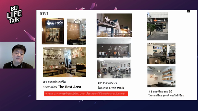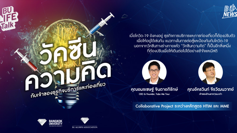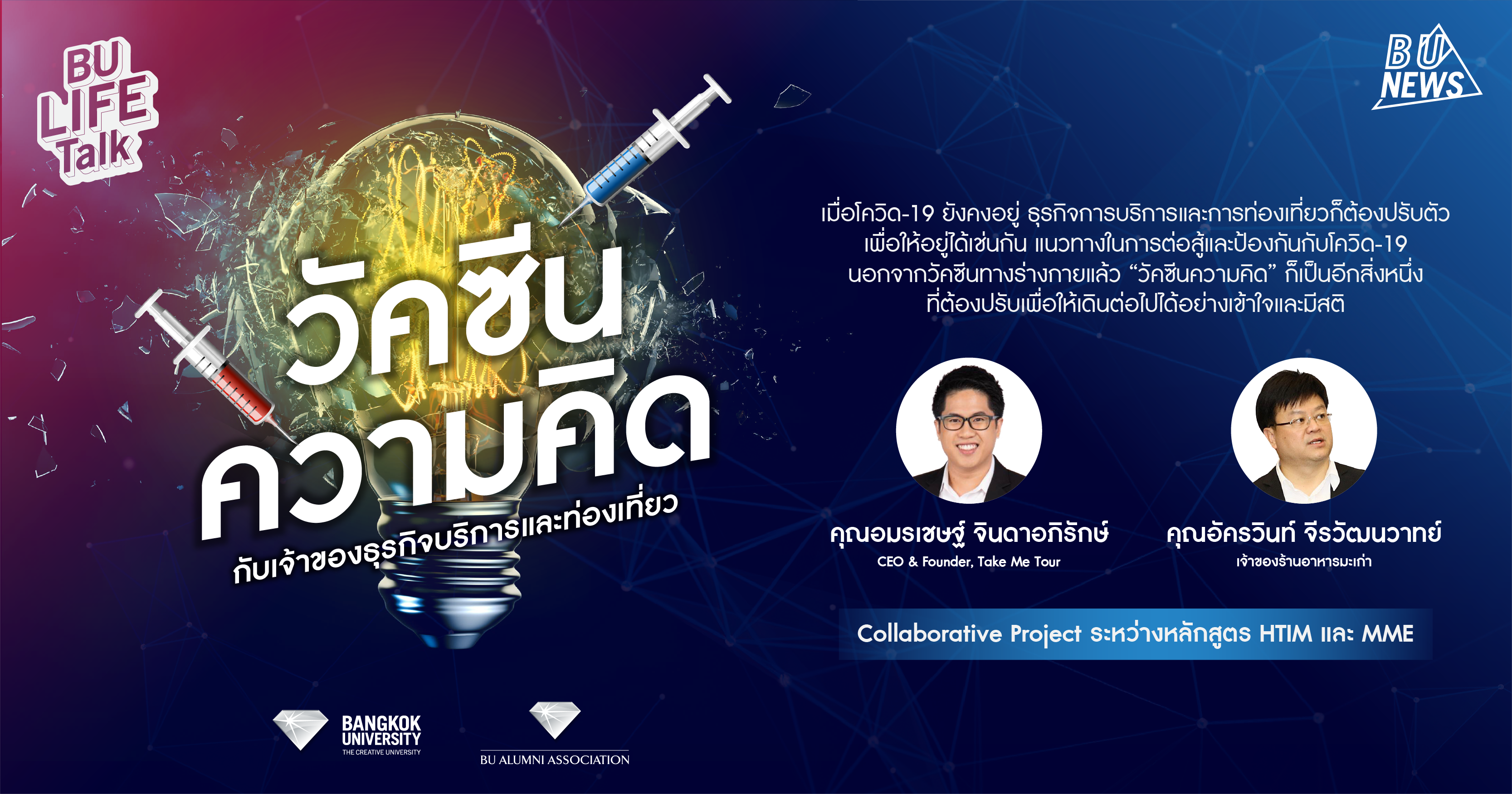 BU LIFE Talk ติดอาวุธ เสริมทักษะชีวิต เตรียมความพร้อมก่อนลงสนามจริง ครั้งที่ 5 พบกับ "วัคซีนความคิดกับเจ้าของธุรกิจบริการและท่องเที่ยว" โดยคุณอมรเชษฐ์ จินดาอภิรักษ์ CEO & Founder, Take Me Tour และคุณอัครวินท์ จีรวัฒนวาทย์ เจ้าของร้านอาหารมะเก่า ที่มาร่วมหาแนวทางในการต่อสู้และป้องกันกับโควิด-19 ของธุรกิจการบริการและการท่องเที่ยวในการปรับตัวเพื่อให้อยู่ได้ด้วยวัคซีนทางความคิดเพื่อให้เดินต่อไปได้อย่างเข้าใจและมีสติ